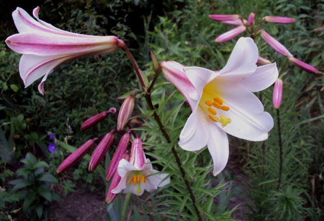 Teraz trochę się powtórzę - podobne info było już w poście zeszłorocznym poświęconym liliom. No, ale królewskość lilii do zobowiązuje do królewskiego traktowania tego gatunku.  Lilium regale pochodzi z zachodnich Chin, do Europy dotarła dość późno bo dopiero w 1903 roku. W zależności od warunków w jakich przyszło jej bytować osiąga wysokość od  60 centymetrów aż do 2 metrów. Z moich obserwacji wynika że dłuższe siedzenie w  jednym miejscu ( dwa, trzy lata) wpływa na  wzrost ( cebule robią się bardziej zażyte ). Po kwitnieniu usuwam "resztki kwiatowe" ze względu na możliwe osłabienie cebulek, dlatego nie było mi dane zobaczyć nasion tego gatunku. A ta "lelija" zawiązuje nasiona  nawet bez zapylenia, samopylna znaczy. Lilia królewska lubi stanowisko słoneczne, ale dobrze żeby podstawę pędu zasłaniały jej jakieś niższe rośliny. Urośnie właściwie w każdej glebie z wyjątkiem bardzo ciężkich glin czy mocno zasadowego podłoża. Najlepiej udaje się w przepuszczalnej, próchniczej glebie.