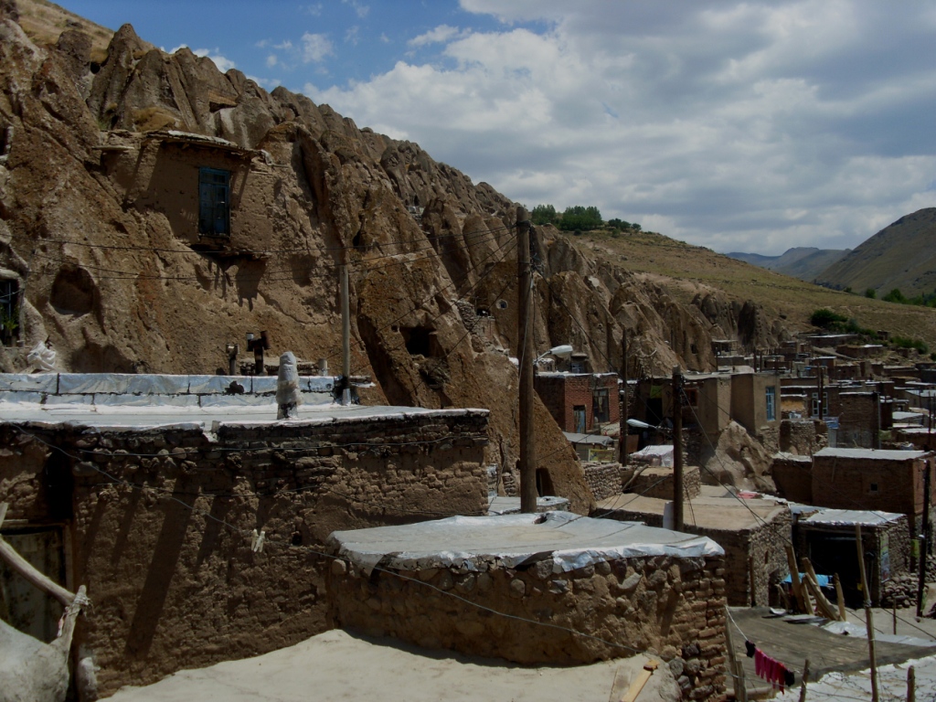 Większość skalnych miast to pamiątki przeszłości, wymarłe jak miasto indian Anasazi. Są na świecie jednak miejsca, w których w wykutych w skałach domach nadal toczy się zwyczajne  życie. Takim miejscem jest Kandovan,   położona w północno-zachodnim Iranie kraina. Skalne miasteczko, a właściwie raczej wioska,  którą zwiedzała Dżizaas jest położona pi razy oko 60 km od  Tebrizu. Kandovan znajduje się  w malowniczej, jak na irańskie warunki solidnie zielonej dolinie, przeciętej rzeką. Dolina ta powstała wskutek działalności wulkanicznej - po erupcji wulkanu Sahand po jego zboczach spływały tzw. lahary czyli potoki błota utworzone z wyrzuconych przez wulkan materiałów i wody. Grubość takiej laharowej warstwy wokół Kandovanu liczy około stu metrów. Wyplute przez Sahand popioły i skały ulegały z czasem erozji i utworzyły  charakterystyczne dla rejonu irańskiej prowincji Wschodniego Azerbejdżanu i tureckiej Kapadocji stożkowate formacje skalne. Najstarsze skalne domy liczą nawet 700 lat, legenda głosi, że pierwsi osadnicy pojawili się na tym terenie uciekając przed atakiem Mongołów. Uciekinierzy najpierw szukali naturalnych zagłębień, czy jaskiń, a potem zaczęli drążyć kryjówki w stosunkowo miękkich skałach ( tralala, tuf i inne pumeksy - pumeksowe te mieszkanka są ). Ziemie w dolinie, jak to gleby wulkaniczne - żyzne, warunki kusiły żeby osiąść tu na stałe. Domy wykute w skale nazywa się "karan" - w lokalnym dialekcie tureckim oznacza to ule czy też może raczej siedlisko pszczół. Przez lata mieszkańcy wsi rozszerzyli swoje rezydencje. Teraz większość domo - grot ma od dwóch do czterech kondygnacji. W środku domostwa są pomieszczenia wszelkiego typu - od salonu do obórek dla zwierząt. Niektóre domy wyrosły ze skał i mają sporą część "budynku" zwyczajnie murowaną. Kandovan dziś robi za atrakcję turystyczną, podobnie jak skalne kościoły w tureckiej Kapadocji.