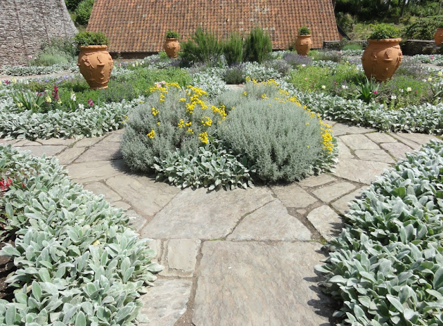 Obszar na poziomie tarasu leżący na wschód od  domu został ukształtowany jako tzw. holenderski ogród z roślinami wieloletnimi.  Jest ich tu stosunkowo mało, to  znaczy nie rośnie w tym miejscu zbyt wiele gatunków ale to co rośnie zostało świetnie dobrane.  Jest duża,  biało kwitnąca Jukka gloriosa,  pionowe elementy że tak to określę wyrastające  z grup  karłowatych odmian lawendy ( Lavandula ), kocimiętki ( Nepeta )  srebrzystego czyśćca ( Stachys ), tak wysrebrzonej  że niemal białej santoliny ( Santolina ),   róż  chińskich ( Rosa chinensis ) lub zimotrwałej  fuksji ( Fuchsia magellanica ). Kiedy mła była w Hestercombe juki były w planach, zastępowały  je chyba rozmaryny. Bo wicie rozumicie to jest tak - ten ogród jest restaurowany a to oznacza że ciągle siedzą nad pierwotnymi planami, notatkami o zmianach w nasadzeniach itd. . Mają w czym grzebać,  niektóre z oryginalnych planów nasadzeń  Gertrude Jekyll zostały odkryte w szopie z doniczkami w Hestercombe, upchane w szufladzie  leżały w spokoju przez prawie 70 lat.  Z kolei badania naukowe ujawniły drugi zestaw planów znajdujący się w kolekcji Reef Point Gardens Uniwersytetu Kalifornijskiego w Berkeley, gdzie naszła  je amerykańska architektka krajobrazu Beatrix Farrand . Cały czas trwają badania i weryfikacja, napiszę tylko że Great Plat była w związku z tym parokrotnie ponownie obsadzana. Metoda prób i błędów ale nie ma się co dziwić, renowacja ogrodów w Hestercombe  to pierwsza próba przywrócenia historycznego edwardiańskiego  ogrodu  do pierwotnego wyglądu podjęta przez władze lokalne w UK. Jedna z pierwszych prób takiej renowacji podjęta przez kogokolwiek w ogóle.