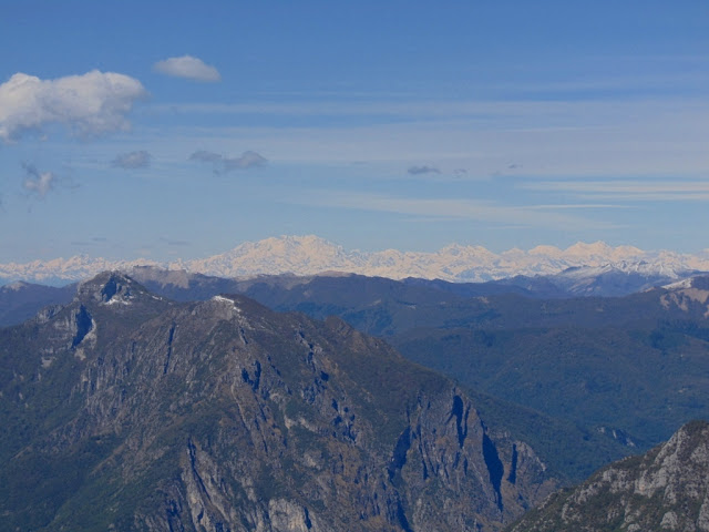 Podjechaliśmy do miejscowości Lecco w której jest kolejka linowa wjeżdżająca na Pizzo d'Erna, szczyt  w Prealpach Bergamskich, wznoszący się 1375 metrów. n.p.m. Kolejka linowa rzecz świetna bo zdobywania szczytu via ferrata nie należy się po paniach starszych spodziewać ( pokonałyśmy rozmarzenia alpinistyczne  Dżizaasa i Jądrzeja wzrokiem, w zamian za co byłyśmy bawione historiami o śmigłowcach przerywających zawieszenie kolejki, do czasu kiedy śmigłowce ratunkowe nie zaczęły się kręcić nieopodal - szukali niedaleko nas jakiegoś nieszczęśnika,  latali wzdłuż zbocza powyżej ). Na górze niespodziewanie ciepło i łagodny wietrzyk. Może to była owa słynna breva więjąca z dołu do góry, znaczy znad jeziora? Mła rozebrała się do rosołu, znaczy T-shirta i oglądała sobie jezioro w dole i góry w śniegu, stojąc w topniejącym śniegu.  Mła się bezczelnie przyzna że w pewnym momencie to nie widoki jeziorne ją najbardziej kręciły. Alpy w śniegu, dalekie szczyty w Szwajcarii doskonale widoczne z Pizzo d'Erna mła interesowały, przez moment nawet głupio pomyślała czy dałaby jeszcze radę tak via ferrata. Na szczęście zobaczyła stadko podobnych do niej pań starszych zmierzające do jadłopoju przy  kolejce i oprzytomniała.